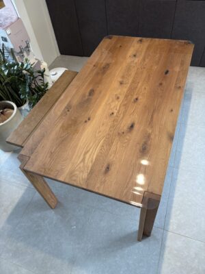 多くのテーブルは天板裏に脚が取り付けられていますが、こちらのテーブルは天板の四隅を切り取り、そこにL字型のような脚があるデザインです。