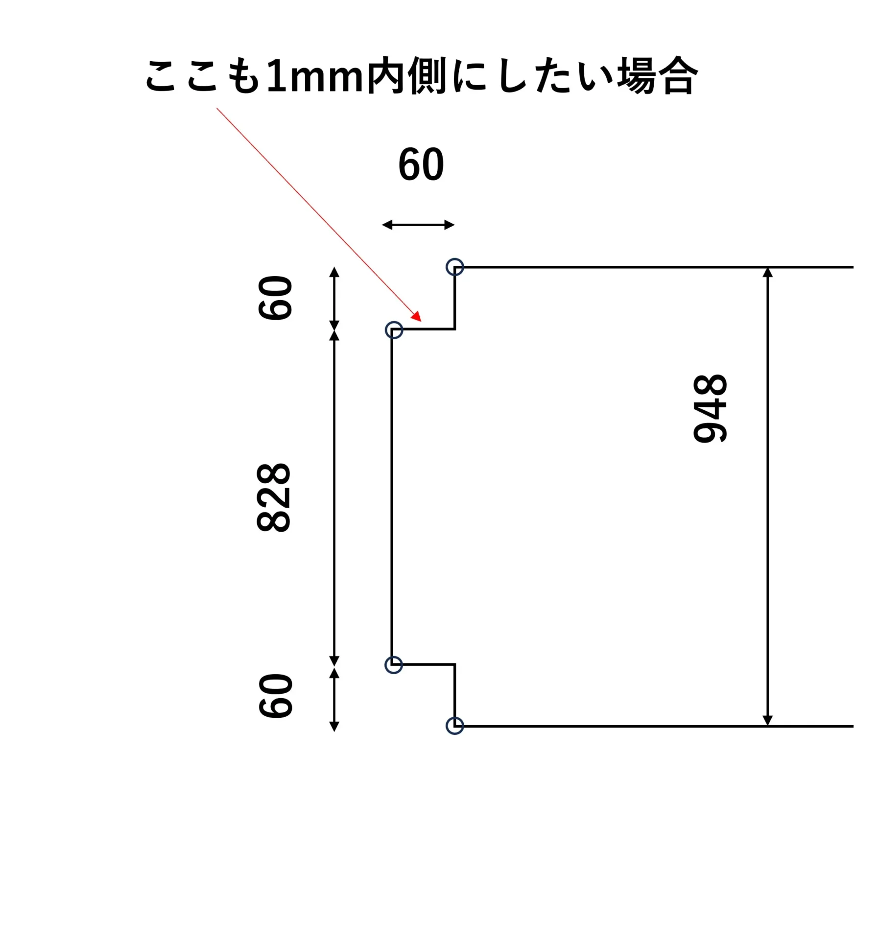 四隅は60×60(mm)ですが、短辺サイズを2㎜小さくする場合は、短辺側を59mm、長辺側を60mmにしていただくのが良いです。