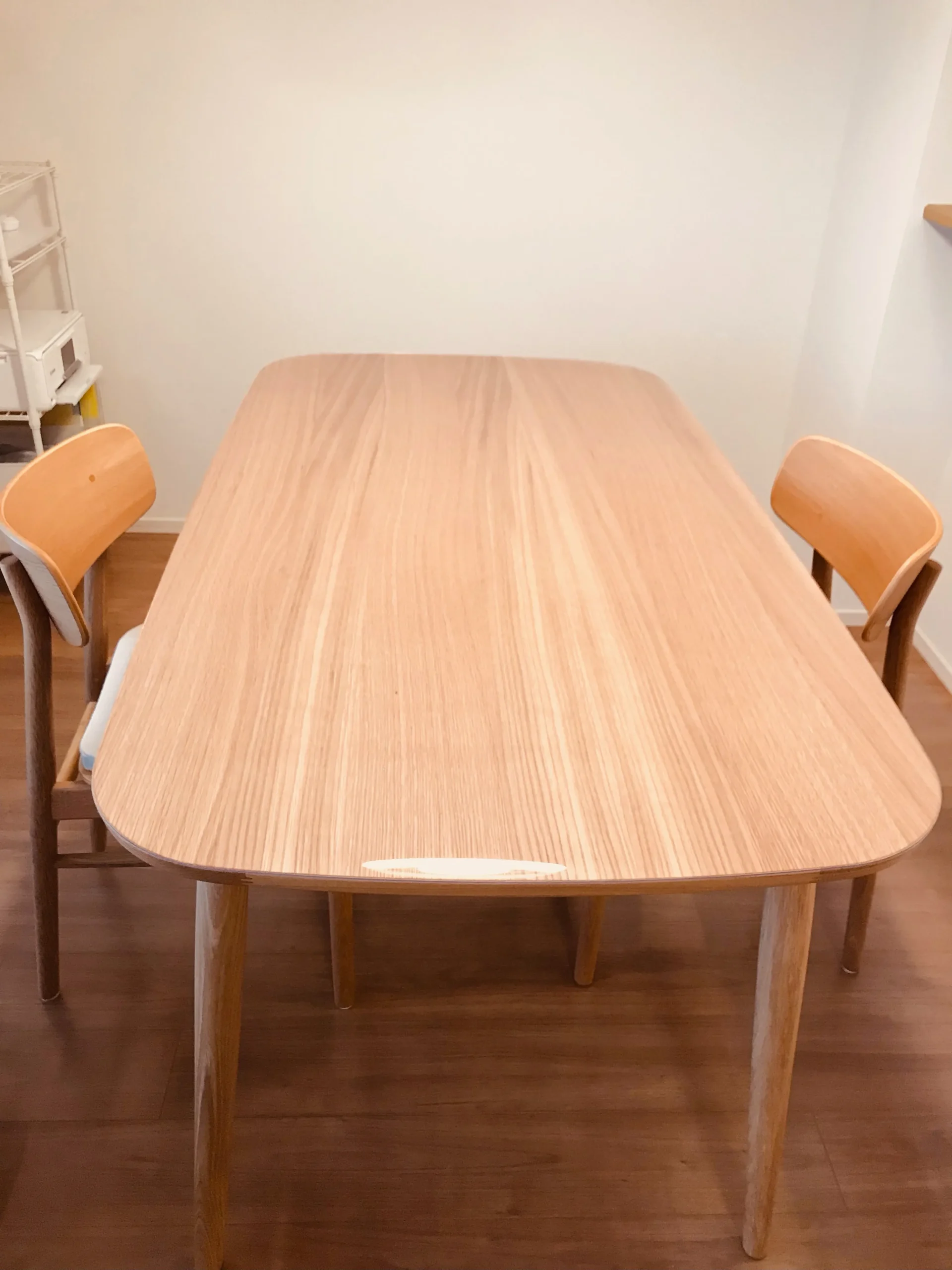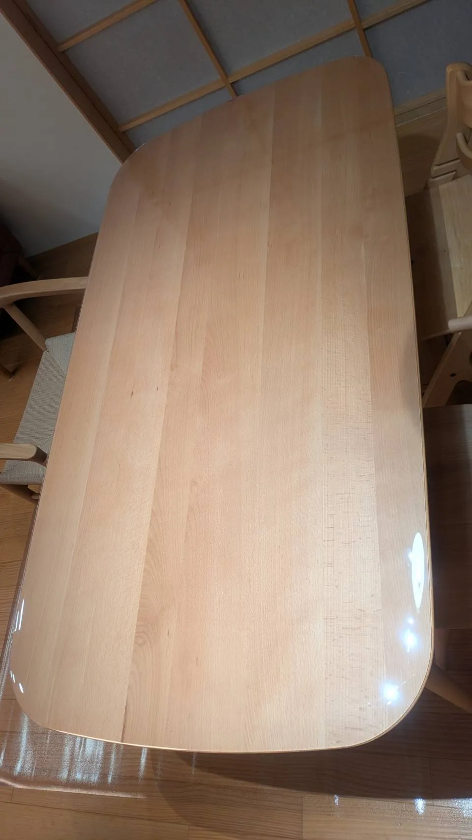 こちらの写真のお客様は、オーク材レビューの中から、静岡県三島市の方のサイズを参考に、ブナ材テーブル丸脚にオーダーいただきました。