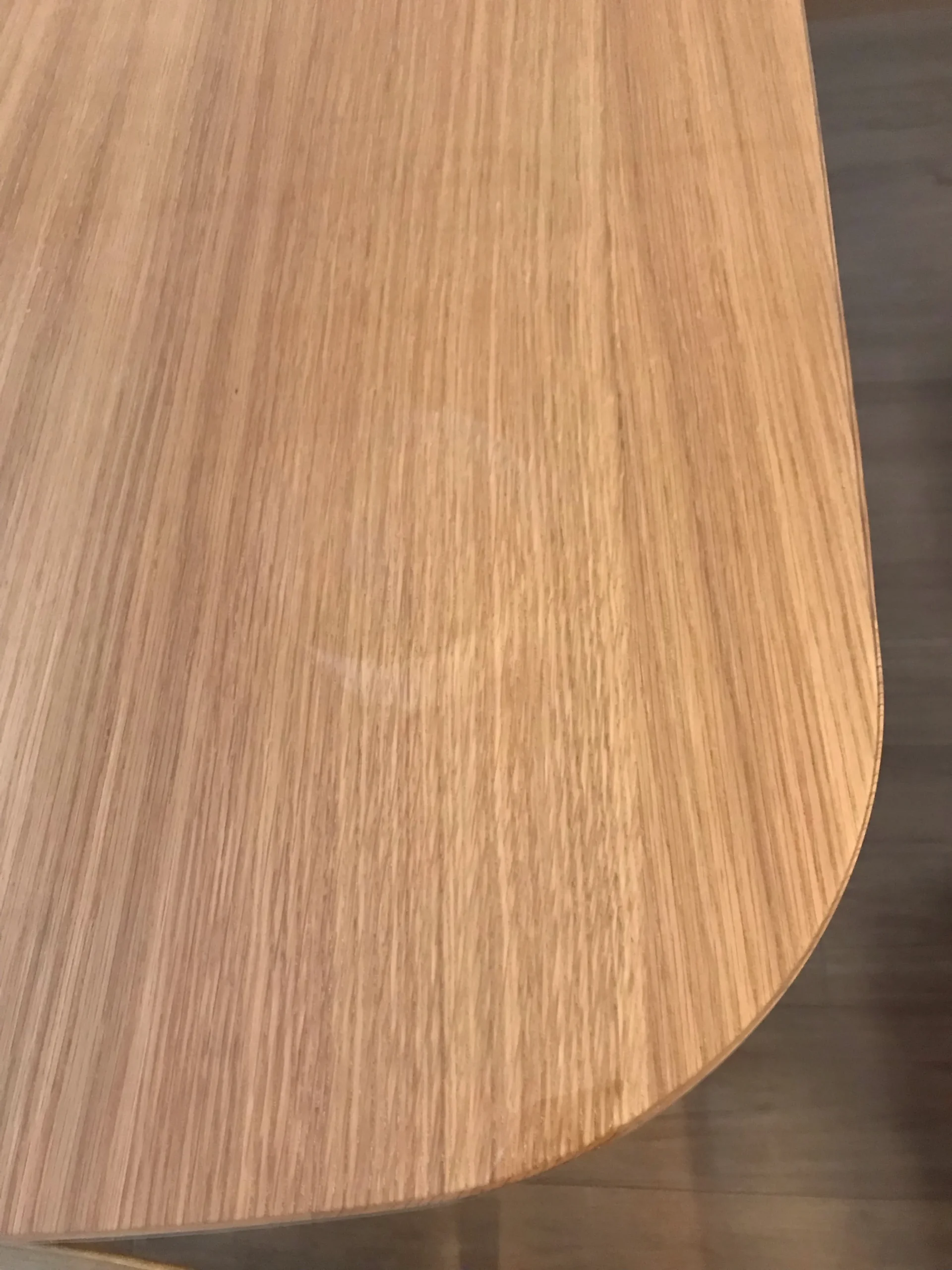 ブナ材テーブル丸脚の天板は縁に丸みがある形状です。当店のマットは厚さが2mmあるため、縁部分も含めたサイズでオーダーいただくと縁部分はマットが浮いた状態になります(縁の丸みについて)。