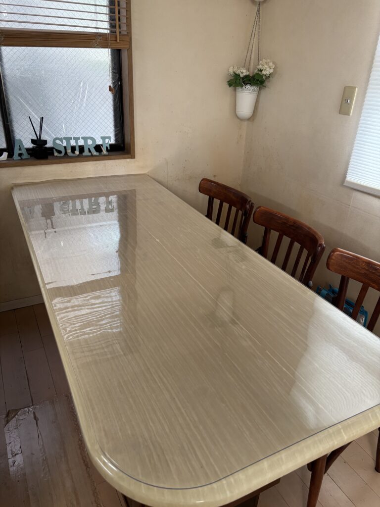 アンティーク家具屋さんで一目惚れしたダイニングテーブルでしたが材質がグラスや皿の跡形が付きやすく布製のクロスを敷いてせっかくの素材を活かせずにいました。