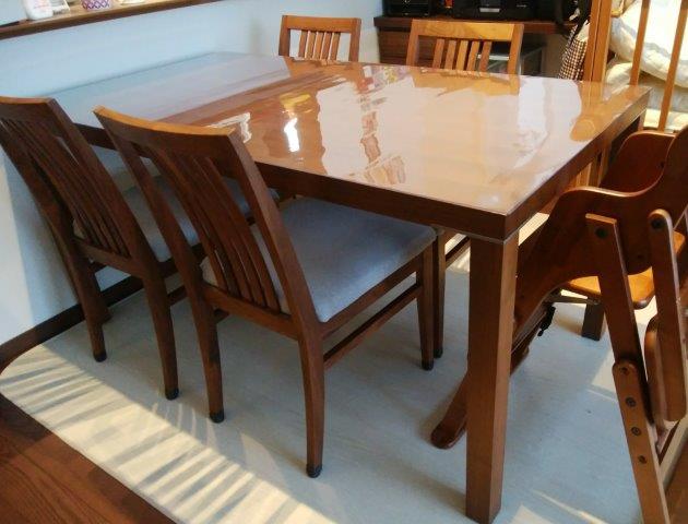 これではせっかくの食事が楽しめない!と思い、無垢の美しさも楽しみつつお手入れも楽になる透明マットを探していたところたどり着いたのがこちらのマットでした。口コミ評価が高いことと、手頃な価格が購入の決めてでした。
