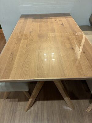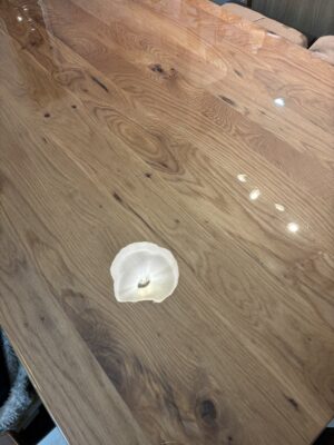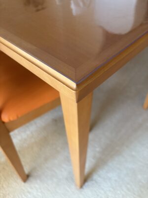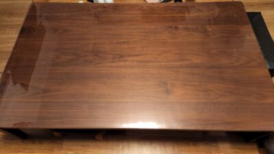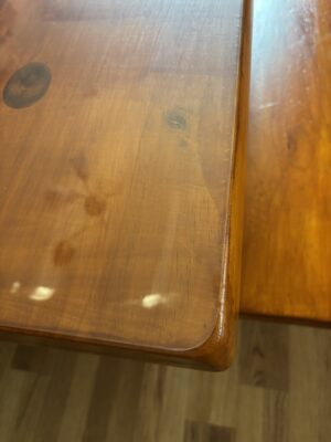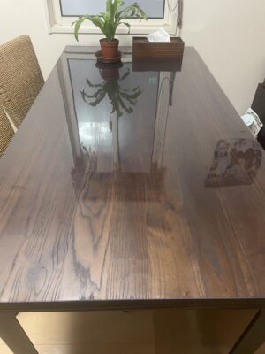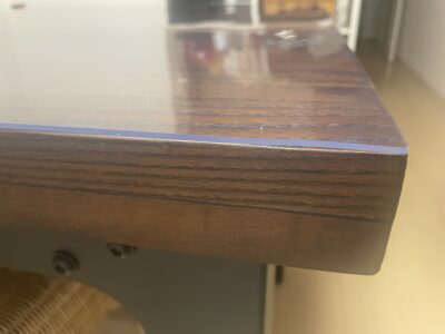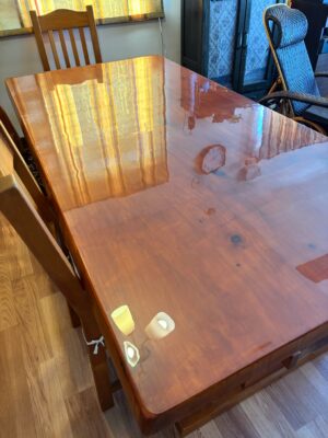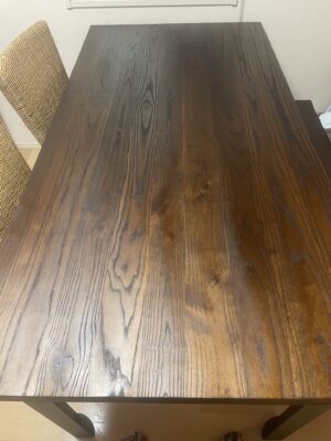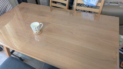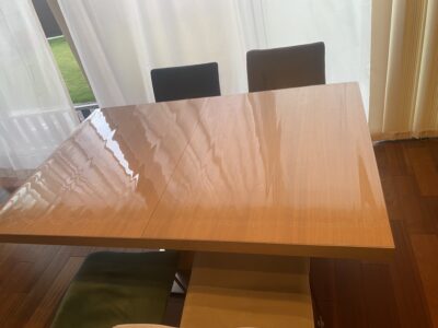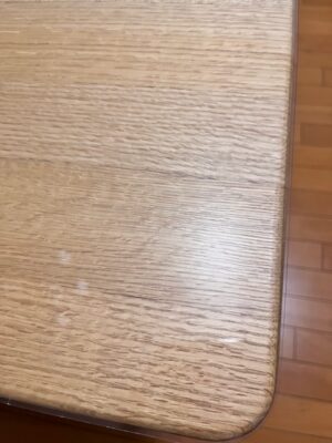 購入して20年以上経つダイニングテーブルの傷が気になって、夫婦で表面を削りニスを塗って再生させました。