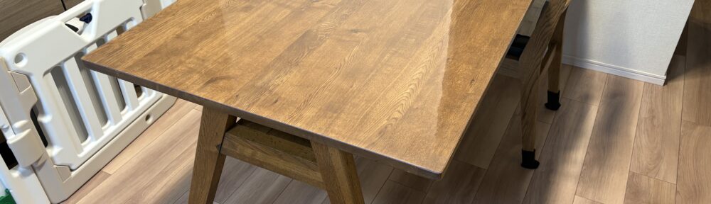 子供の食べこぼしが多いのと、おもちゃで机を傷つけることがたまに見られたため、早いうちに引いて安心できるようにしました。