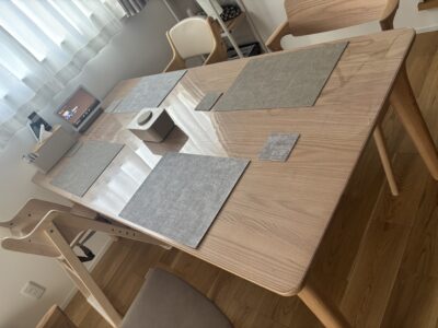 使ってみて、食べかすや、消しかすなどあらゆる場面で汚れは毎日あるけど、マットで保護しているので、テーブルそのものは綺麗なまま保てているし、さっと拭いたり、掃除機をかけたりで綺麗になります。