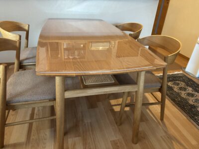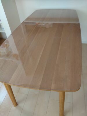 型紙を書いたらその形にカットしてくれるところもありましたが、値段も高いし、失敗したら最悪だなと思い踏み切れず、テーブルクロスをかけて使っていました。
