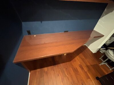 若干長い寸法で届いたため、両側が壁の造作デスクなので、片側が浮いています。