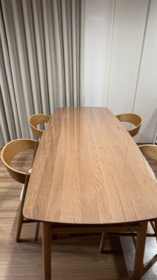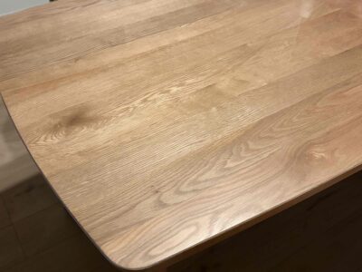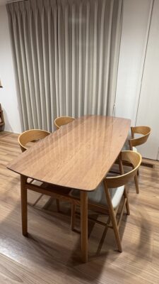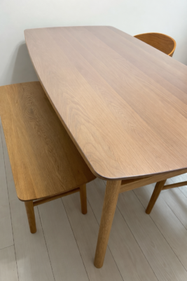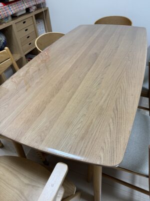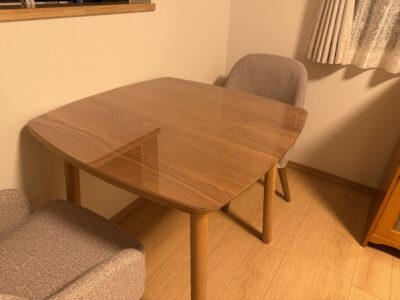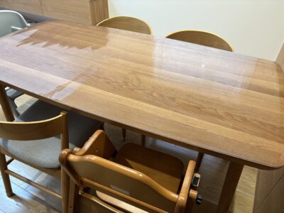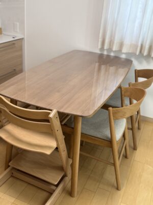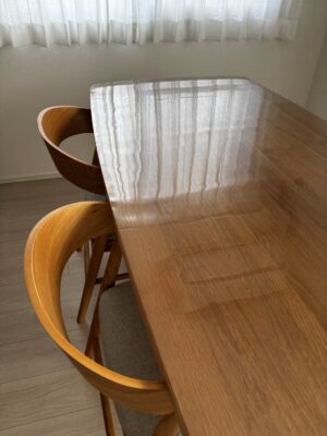 オイル仕上げのテーブルの質感がとても気に入っているのですが、大人だけでの生活でも水染みや食べこぼし等気を遣っていました。