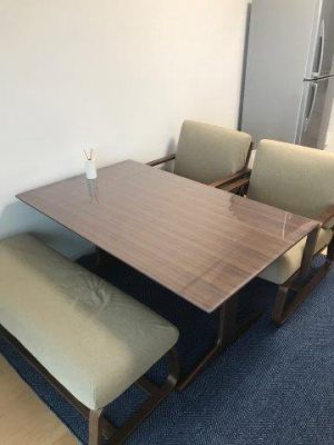 Fuji furniture のKoti W2000 D900 のテーブルを使用しており、今まではテーブルクロスを敷いていましたが、子供がまだ小さく、食べ物をこぼしたり、テーブルクロスを引っ張ったりするため、透明テーブルマットを検討しました。
